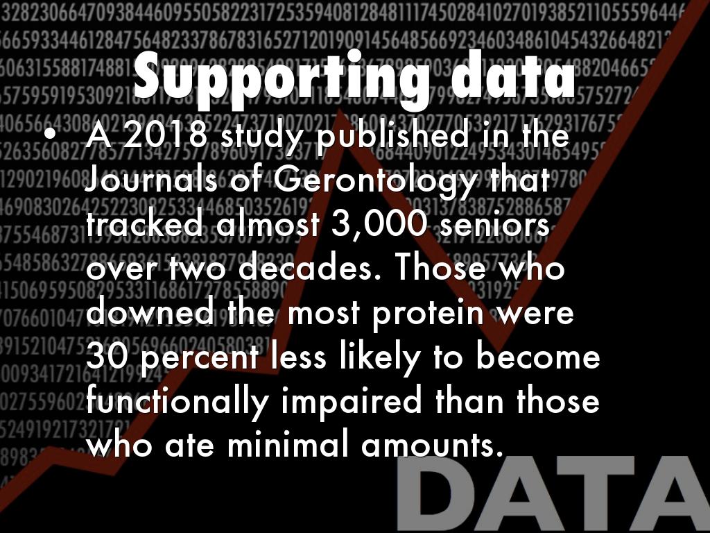 A 2018 study published in the Journals of Gerontology that tracked almost 3,000 seniors over two decades. Those who downed the most protein were 30 percent less likely to become functionally impaired than those who ate minimal amounts.