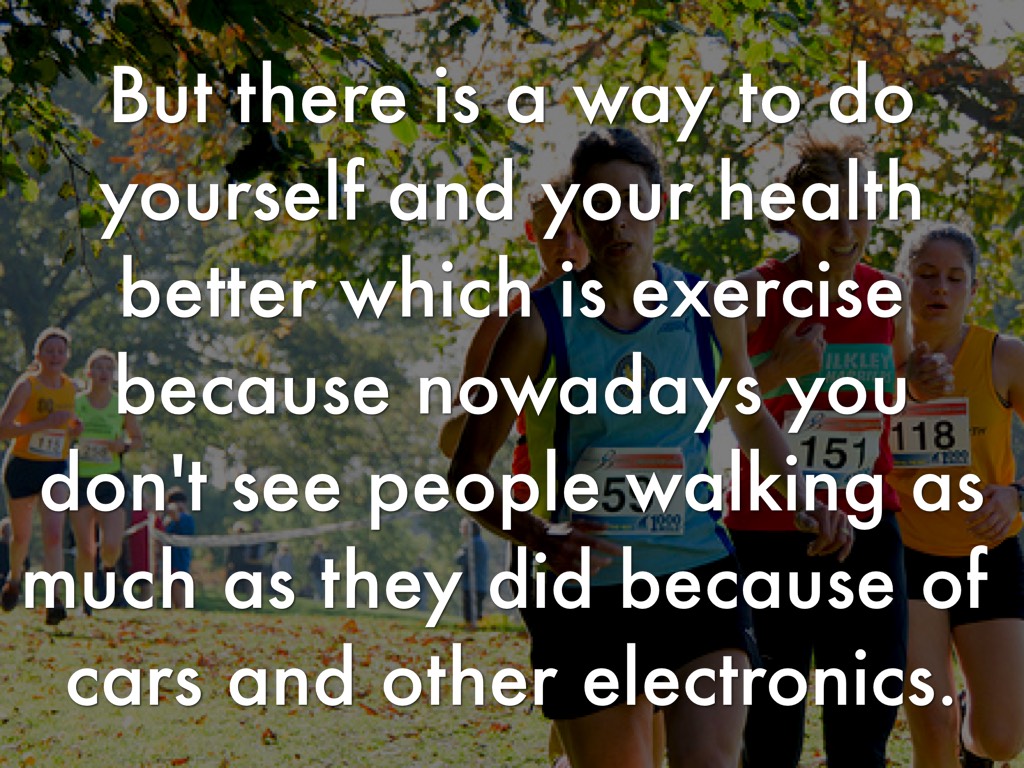 But there is a way to do yourself and your health better which is exercise because nowadays you don't see people walking as much as they did because of cars and other electronics.