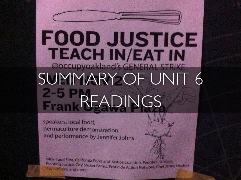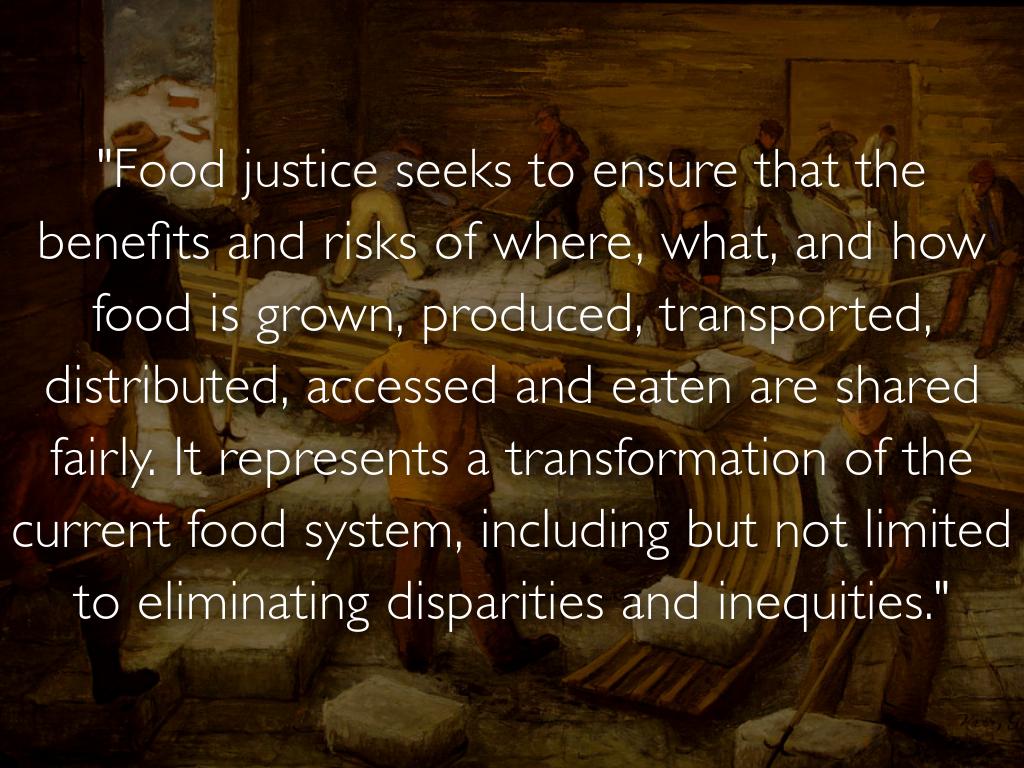 https://www-erudit-org.ezproxy.library.uvic.ca/fr/revues/cuizine/2016-v7-n2...• Food justice, like environmental justice, is a powerful idea. It resonates with many groups and can be invoked to expand the support base for bringing about community change and a different kind of food system. It has the potential to link different kinds of advocates, including those concerned with health, the environment, food quality, globalization, workers’ rights and working conditions, access to fresh and affordable food, and more sustainable land use.