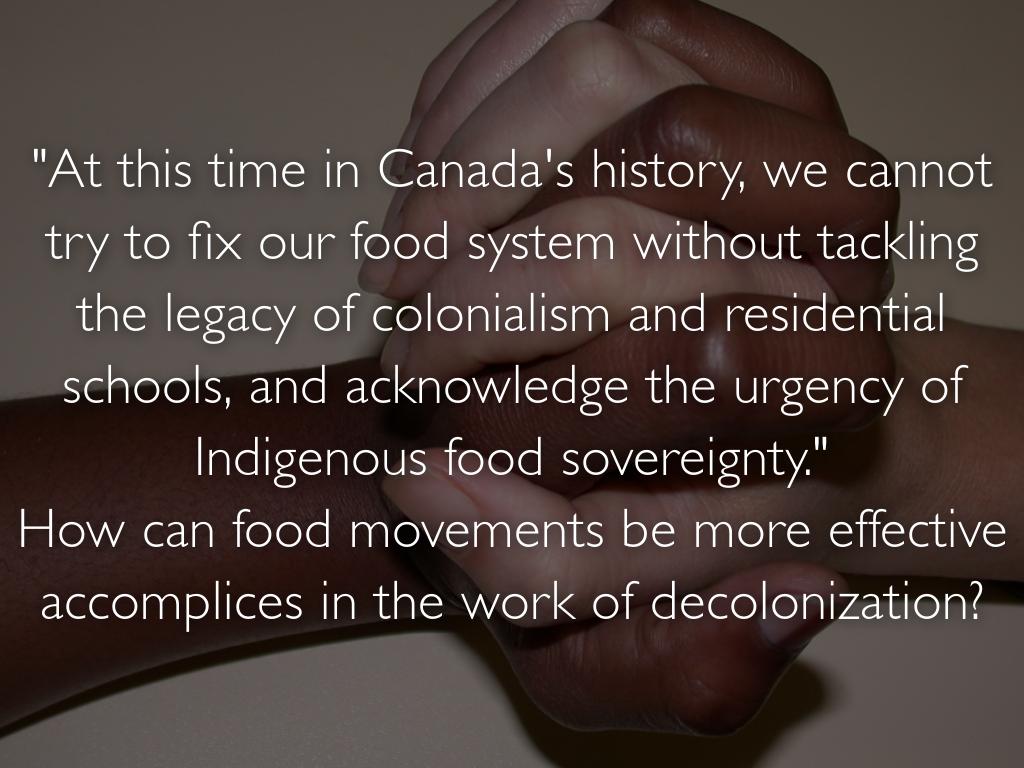 Matties, Z. (2016). Unsettling Settler Food Movements: Food Sovereignty and Decolonization in Canada. The Journal of Canadian Food Cultures / Cuizine: revue des cultures culinaires au Canada. Retrieved from: