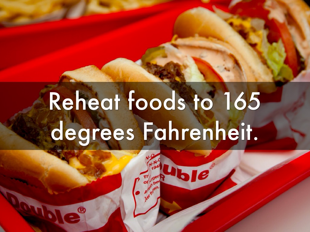 Reheat foods to 165 degrees Fahrenheit.