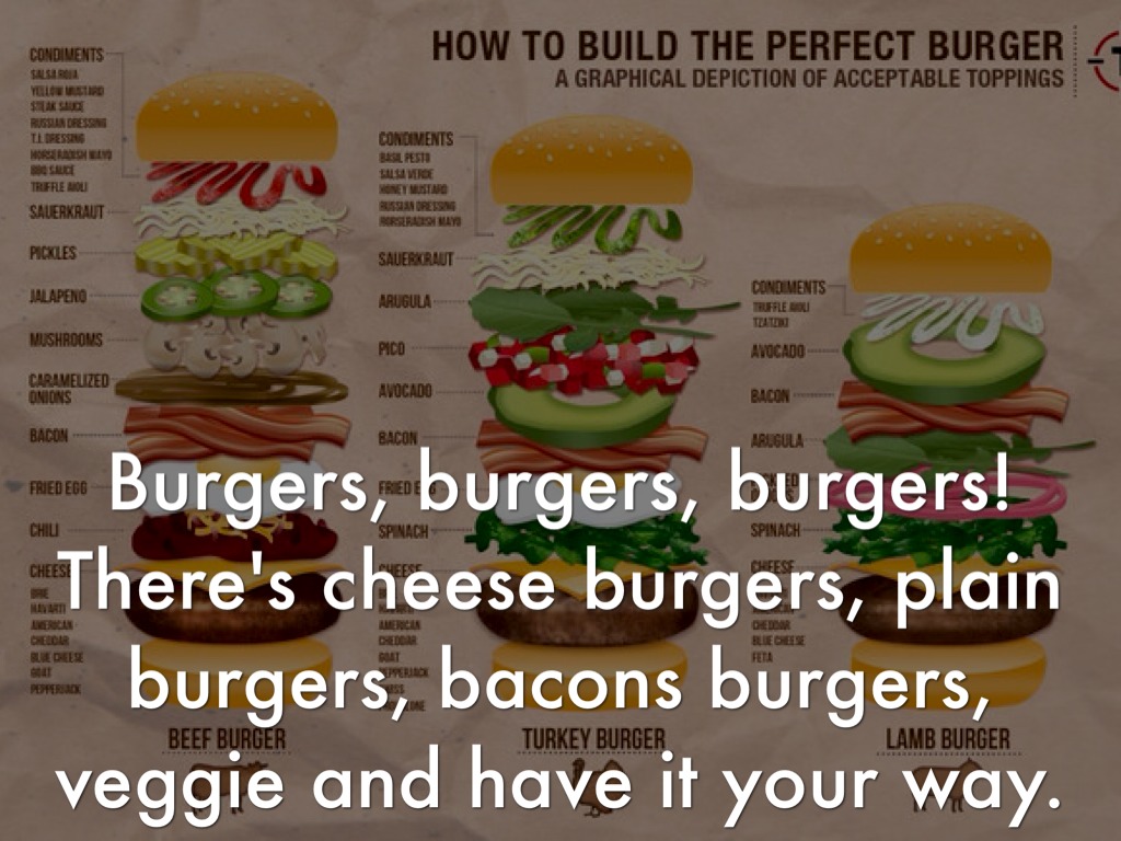 There's cheese burgers, plain burgers, bacons burgers, veggie and have it your way.