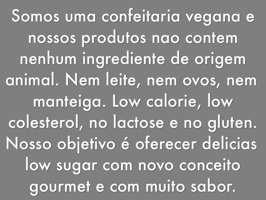 Somos uma confeitaria vegana e nossos produtos nao contem nenhum ingrediente de origem animal. Nem leite, nem ovos, nem manteiga. Low calorie, low colesterol, no lactose e no gluten. Nosso objetivo é oferecer delicias low sugar com novo conceito gourmet e com muito sabor.