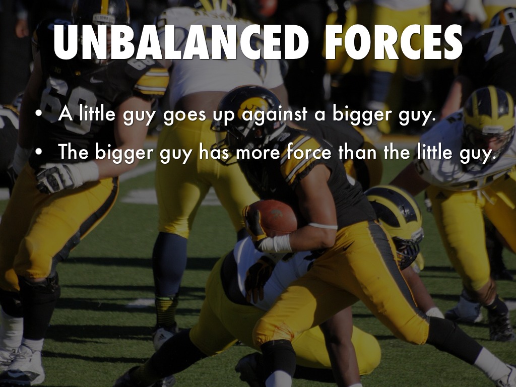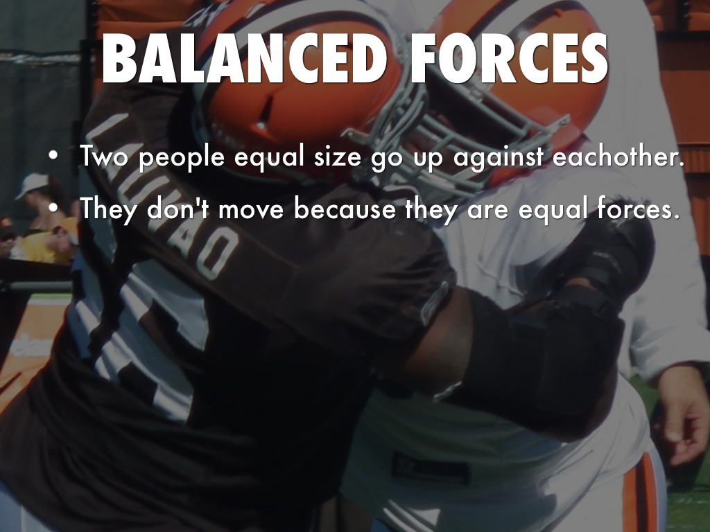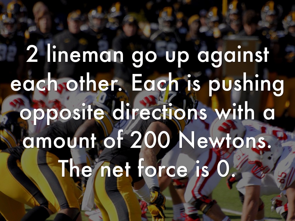 2 lineman go up against each other. Each is pushing opposite directions with a amount of 200 Newtons. The net force is 0.