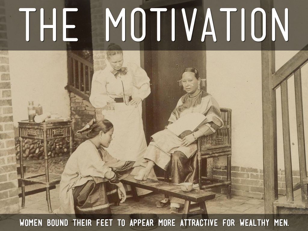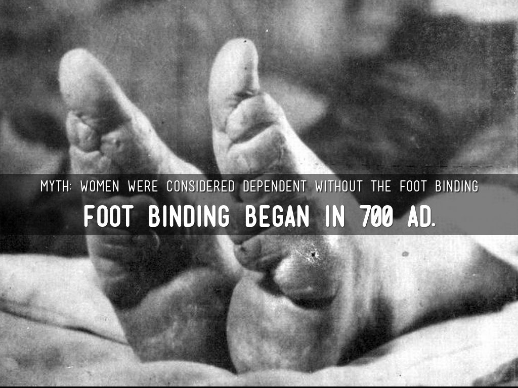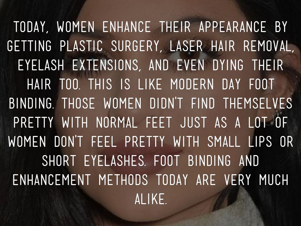 Today, Women enhance their appearance by getting plastic surgery, laser hair removal, eyelash extensions, and even dying their hair too. This is like modern day foot binding. Those women didn't find themselves pretty with normal feet just as a lot of women don't feel pretty with small lips or short eyelashes. Foot binding and enhancement methods today are very much alike.