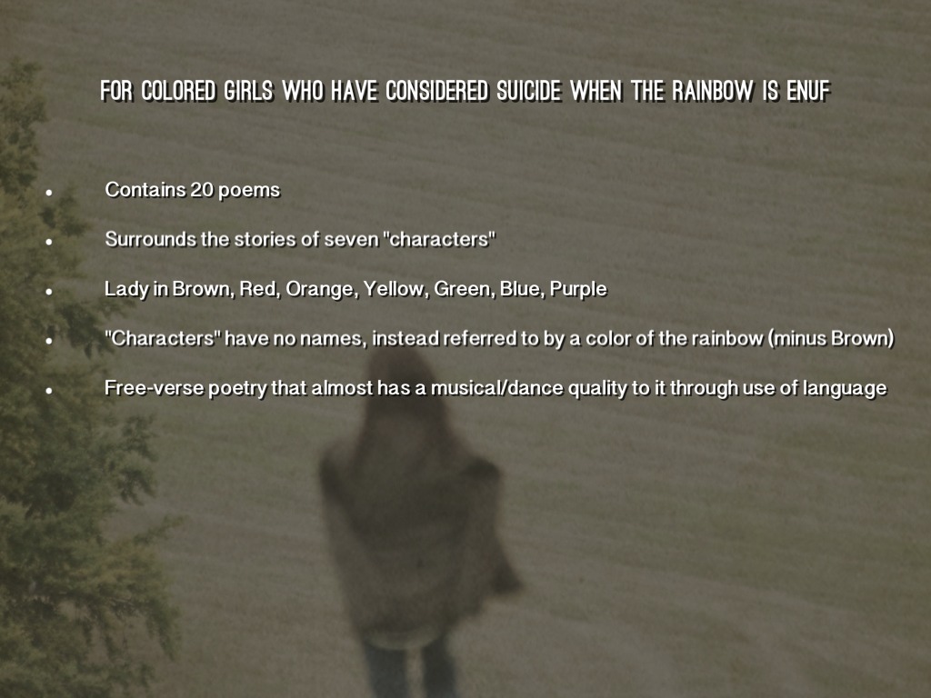 FOR COLORED GIRLS WHO HAVE CONSIDERED SUICIDE WHEN THE RAINBOW IS ENUF