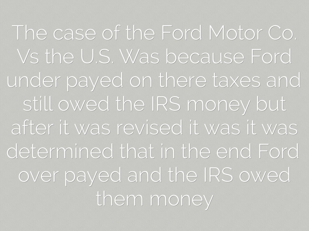 The case of the Ford Motor Co. Vs the U.S. Was because Ford under payed on there taxes and still owed the IRS money but after it was revised it was it was determined that in the end Ford over payed and the IRS owed them money