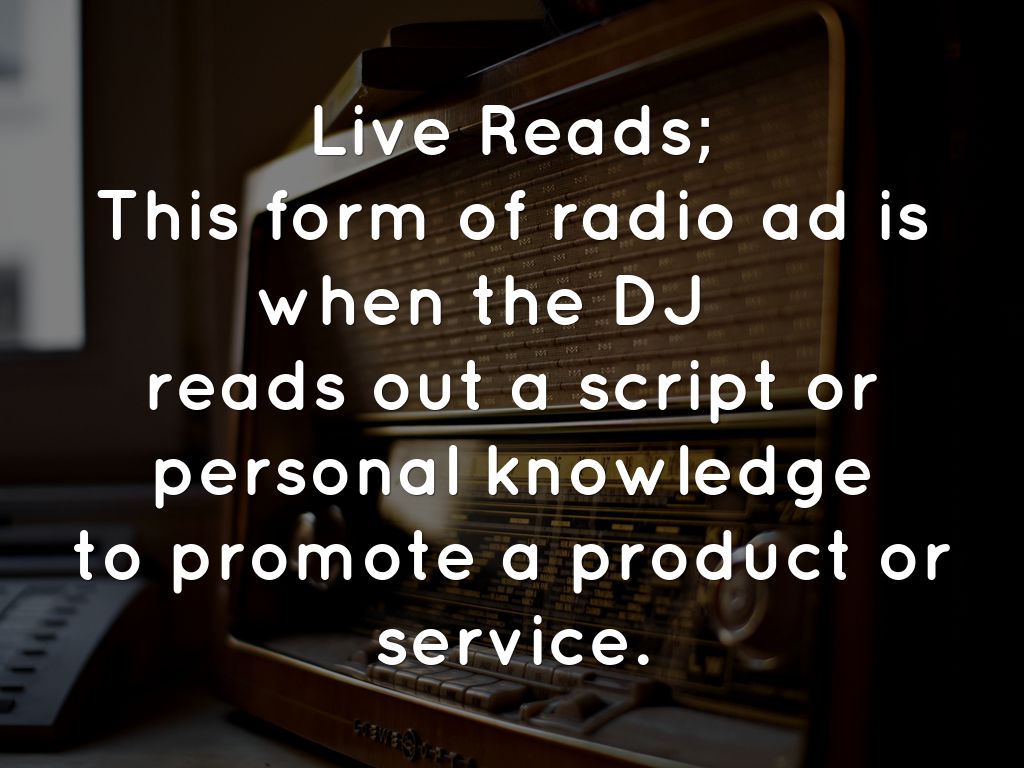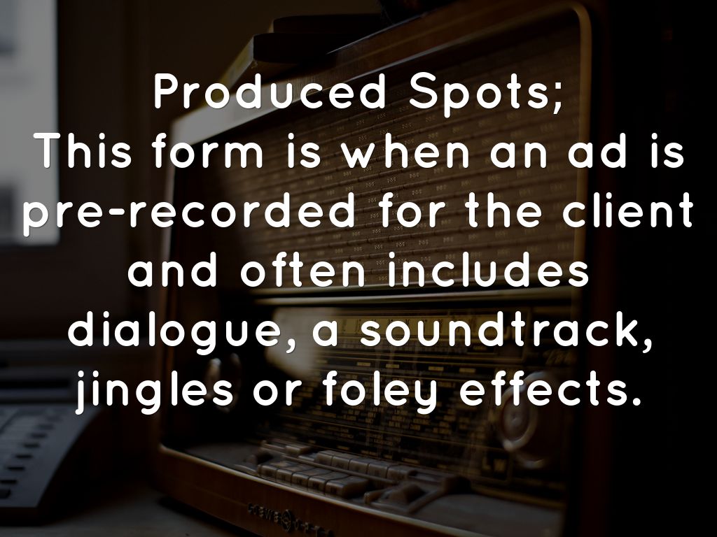 This form is when an ad is pre-recorded for the client and often includes dialogue, a soundtrack, jingles or foley effects.
