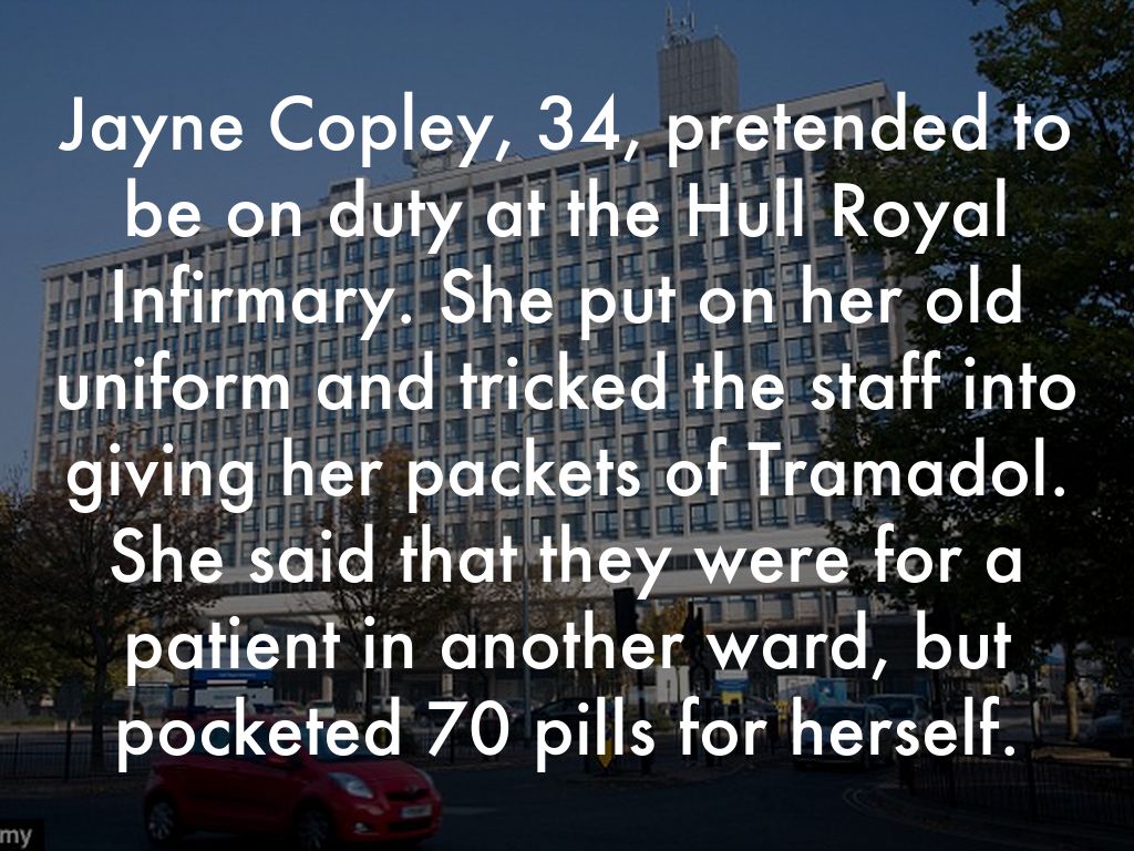Jayne Copley, 34, pretended to be on duty at the Hull Royal Infirmary. She put on her old uniform and tricked the staff into giving her packets of Tramadol.