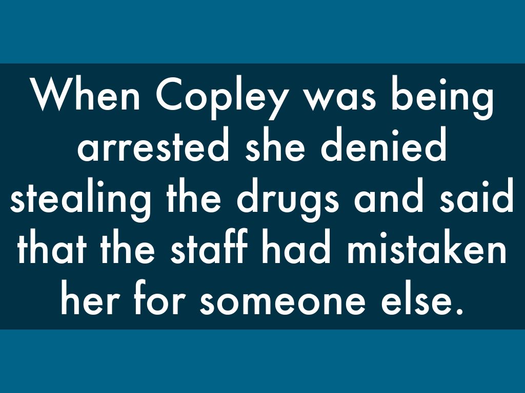 When Copley was being arrested she denied stealing the drugs and said that the staff had mistaken her for someone else.