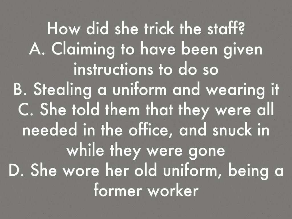 C. She told them that they were all needed in the office, and snuck in while they were gone