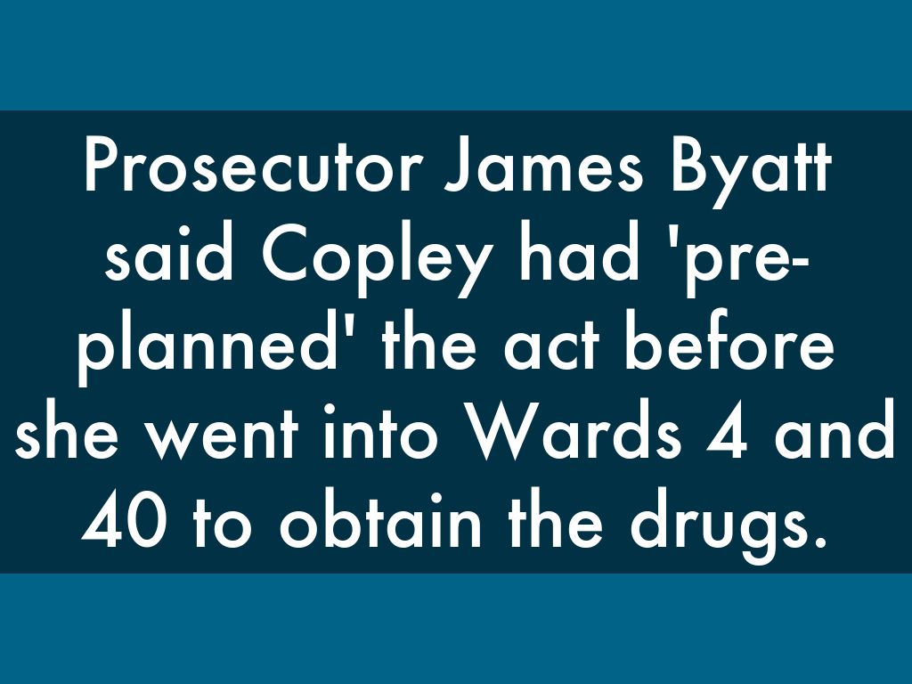 Prosecutor James Byatt said Copley had 'pre-planned' the act before she went into Wards 4 and 40 to obtain the drugs.