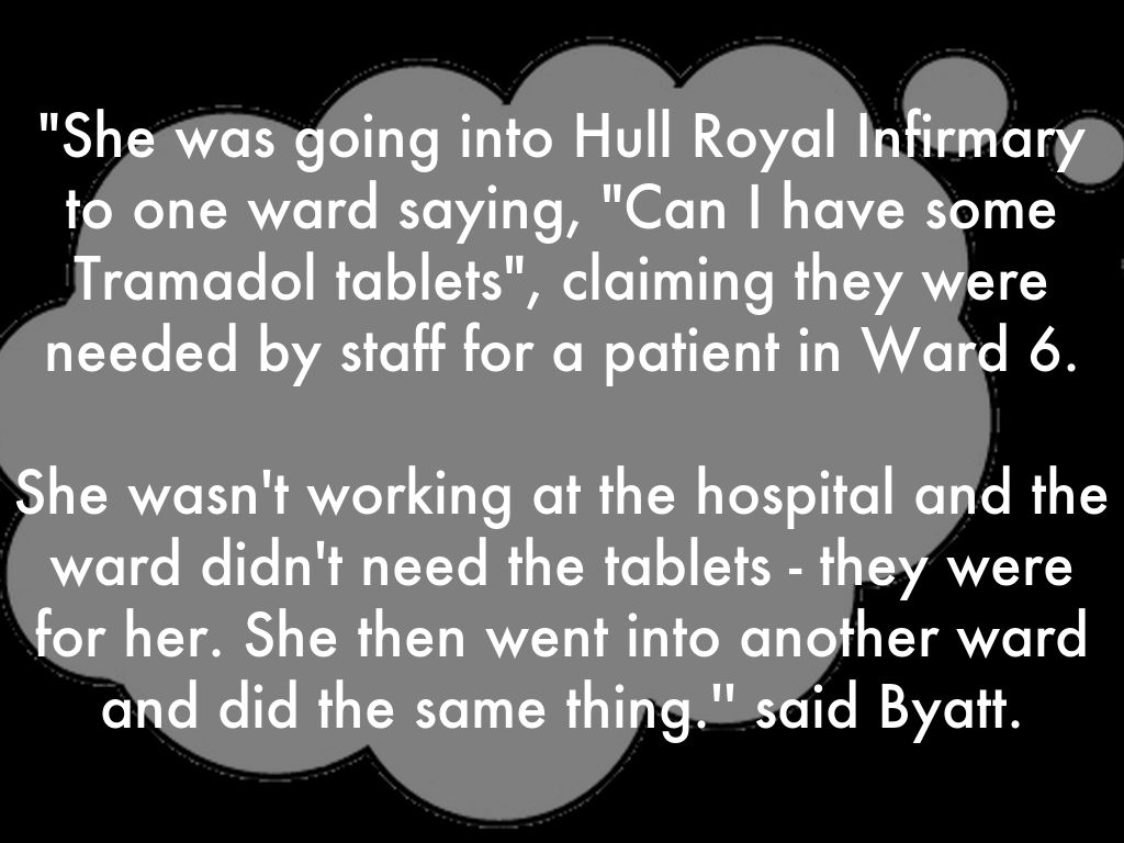 "She was going into Hull Royal Infirmary to one ward saying, "Can I have some Tramadol tablets", claiming they were needed by staff for a patient in Ward 6.