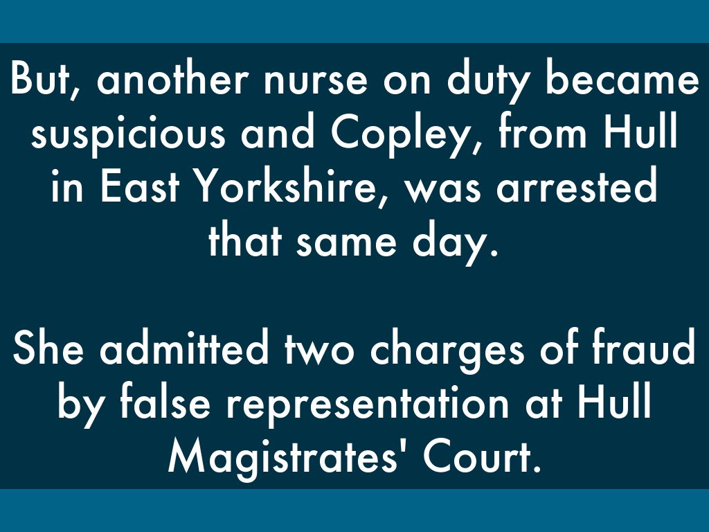 But, another nurse on duty became suspicious and Copley, from Hull in East Yorkshire, was arrested that same day.