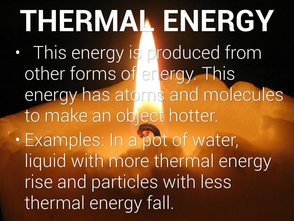 This energy is produced from other forms of energy. This energy has atoms and molecules to make an object hotter.