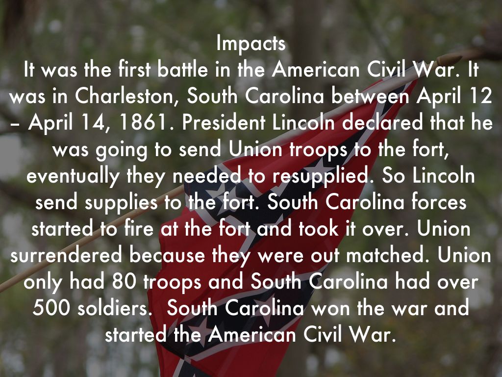 Impacts It was the first battle in the American Civil War. It was in Charleston, South Carolina between April 12 – April 14, 1861. President Lincoln declared that he was going to send Union troops to the fort, eventually they needed to resupplied. So Lincoln send supplies to the fort. South Carolina forces started to fire at the fort and took it over. Union surrendered because they were out matched. Union only had 80 troops and South Carolina had over 500 soldiers. South Carolina won the war and started the American Civil War.