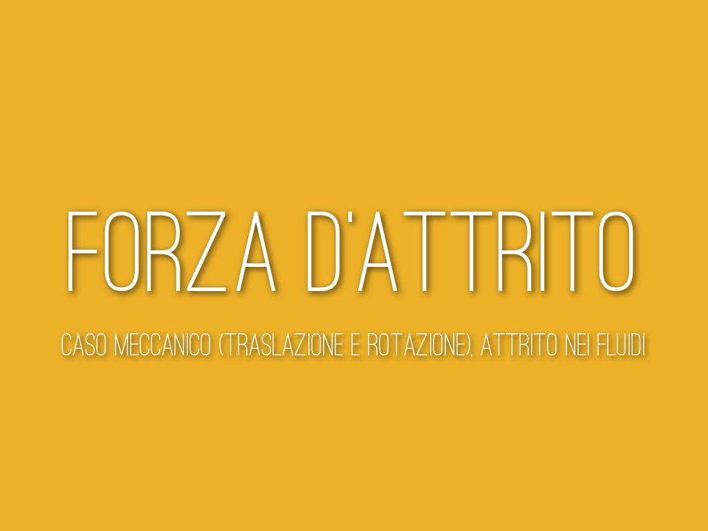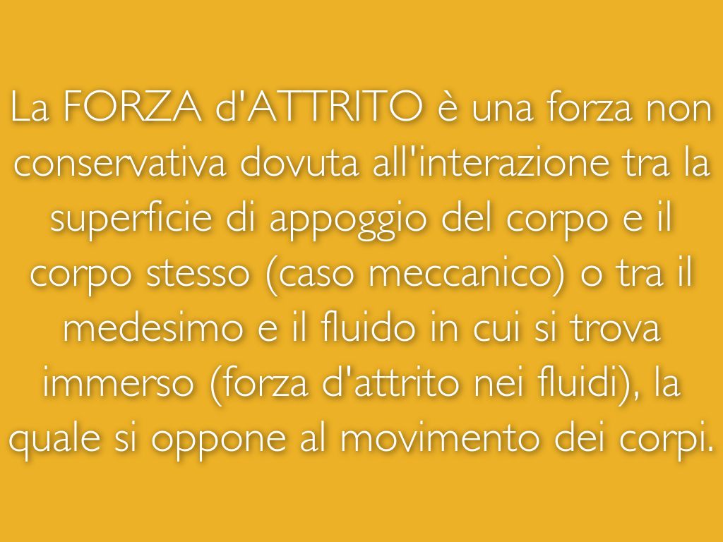 La FORZA d'ATTRITO è una forza non conservativa dovuta all'interazione tra la superficie di appoggio del corpo e il corpo stesso (caso meccanico) o tra il medesimo e il fluido in cui si trova immerso (forza d'attrito nei fluidi), la quale si oppone al movimento dei corpi.
