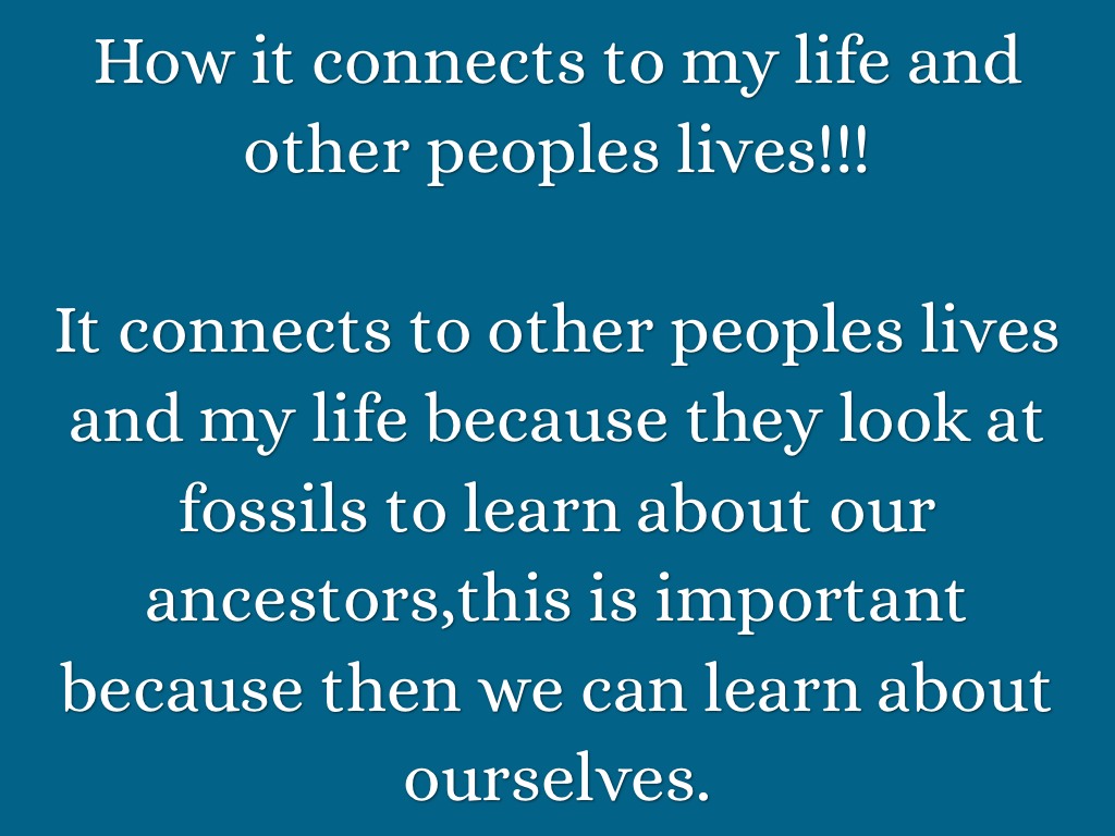 It connects to other peoples lives and my life because they look at fossils to learn about our ancestors,this is important because then we can learn about ourselves.
