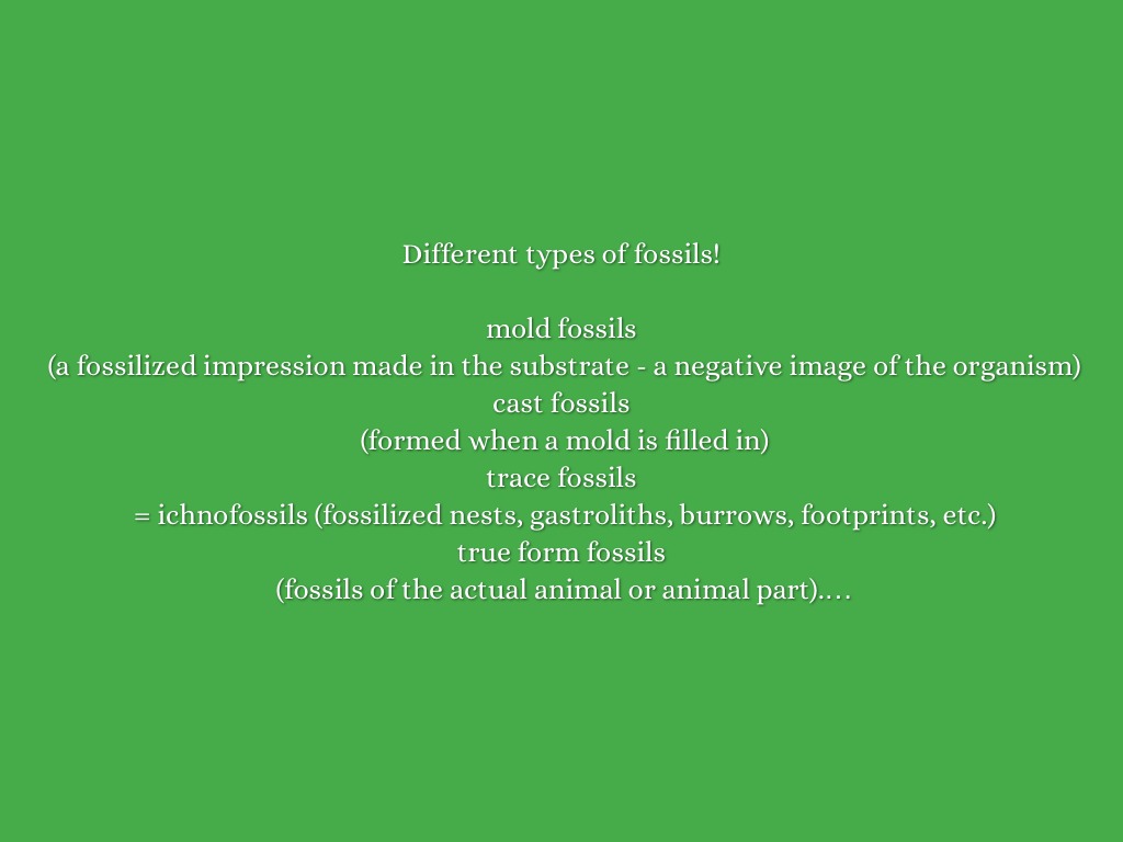 = ichnofossils (fossilized nests, gastroliths, burrows, footprints, etc.)