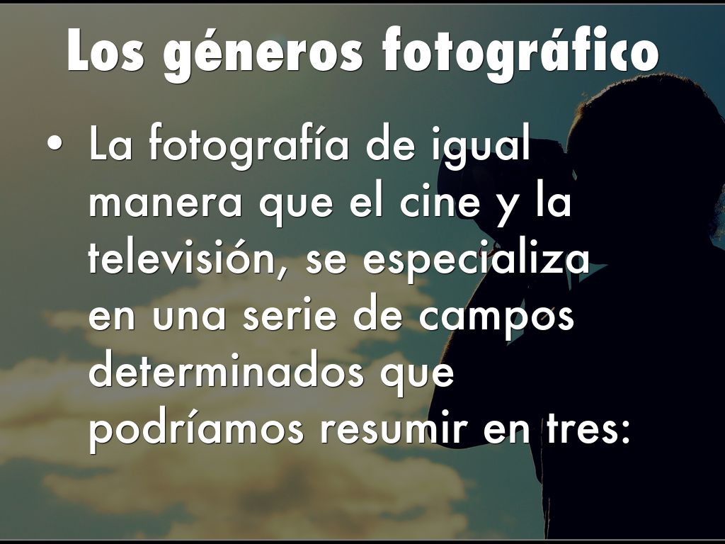 La fotografía de igual manera que el cine y la televisión, se especializa en una serie de campos determinados que podríamos resumir en tres: