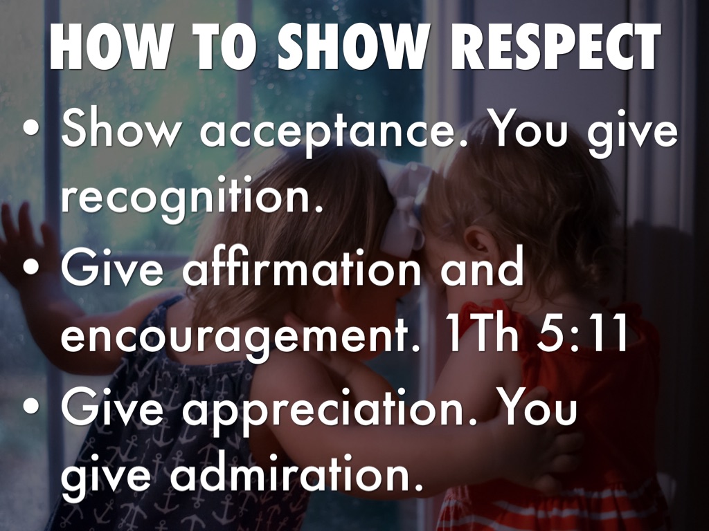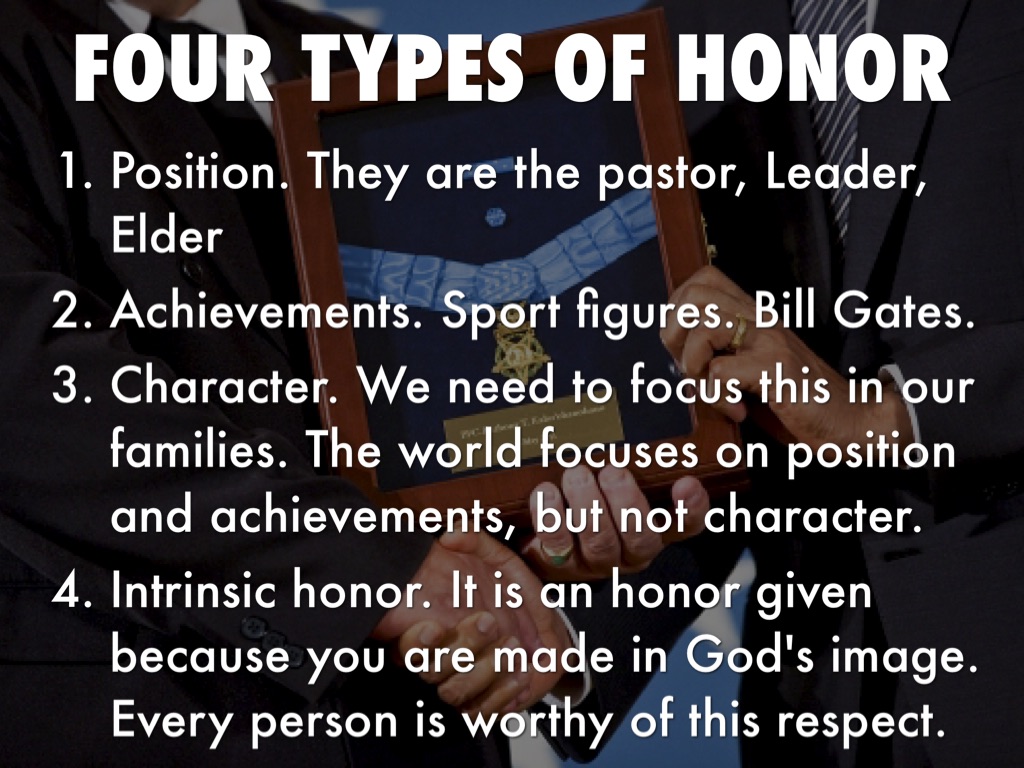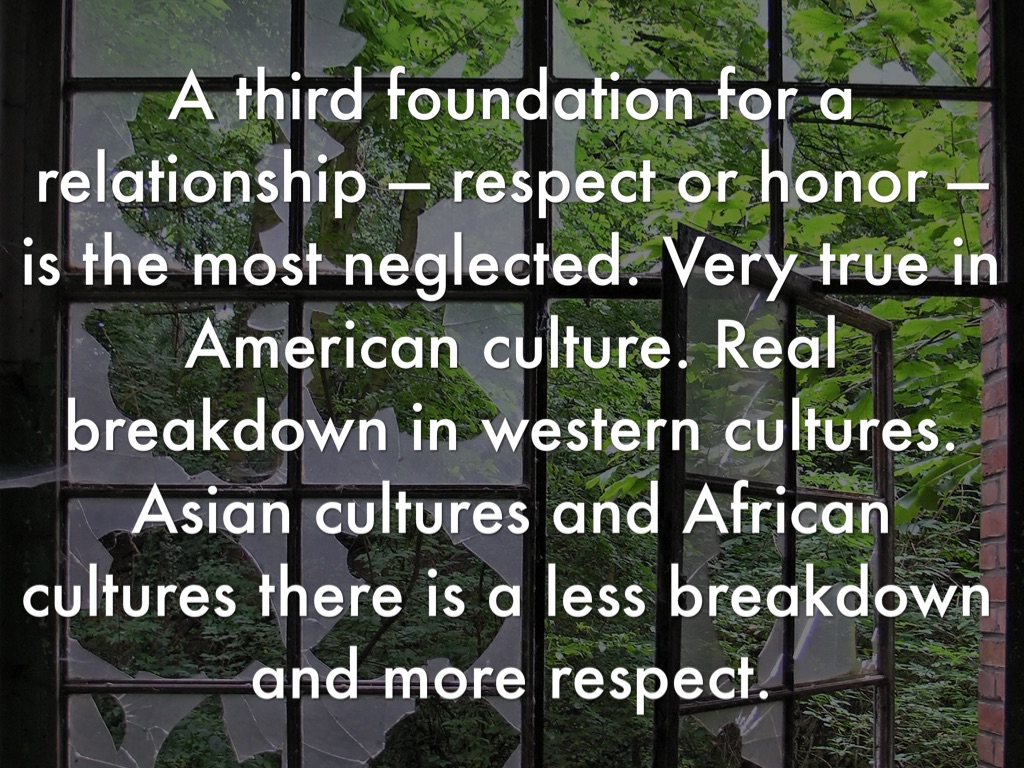 A third foundation for a relationship — respect or honor — is the most neglected. Very true in American culture. Real breakdown in western cultures. Asian cultures and African cultures there is a less breakdown and more respect.