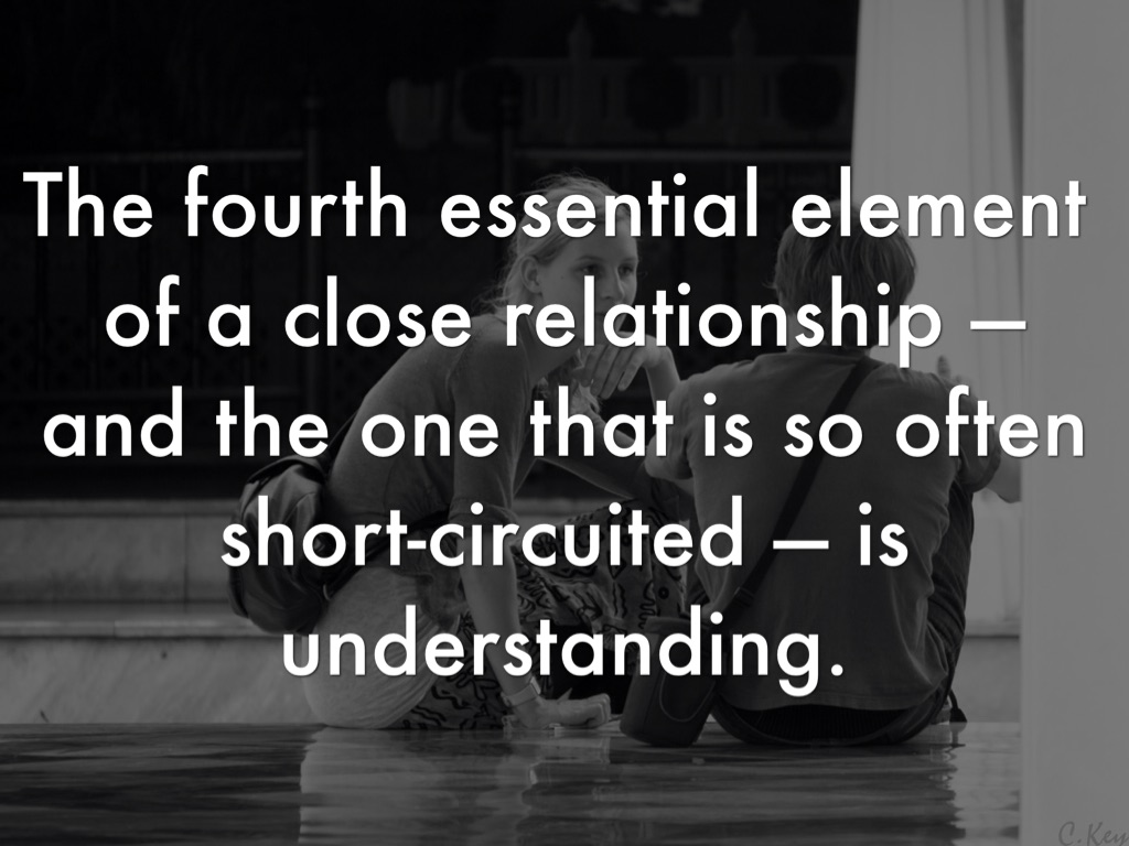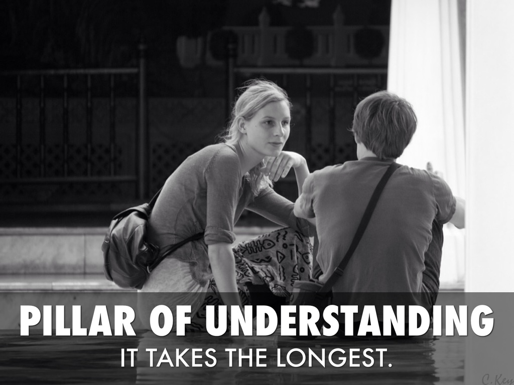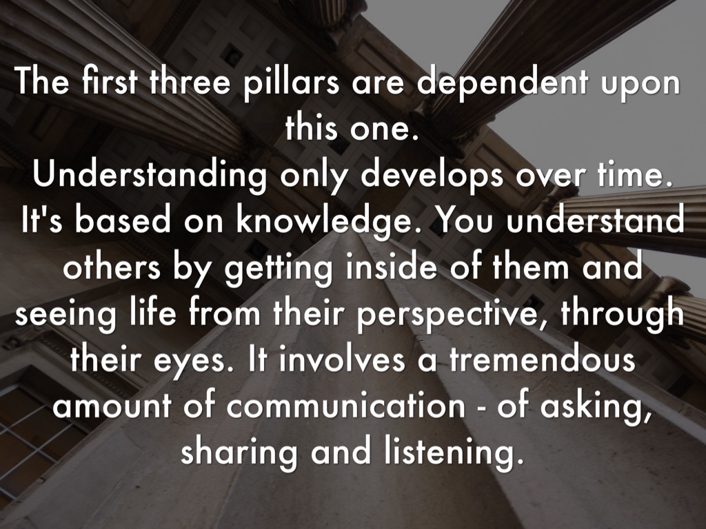 The first three pillars are dependent upon this one. Understanding only develops over time. It's based on knowledge. You understand others by getting inside of them and seeing life from their perspective, through their eyes. It involves a tremendous amount of communication - of asking, sharing and listening.