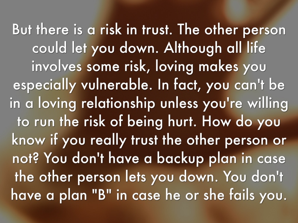 But there is a risk in trust. The other person could let you down. Although all life involves some risk, loving makes you especially vulnerable. In fact, you can't be in a loving relationship unless you're willing to run the risk of being hurt. How do you know if you really trust the other person or not? You don't have a backup plan in case the other person lets you down. You don't have a plan "B" in case he or she fails you.