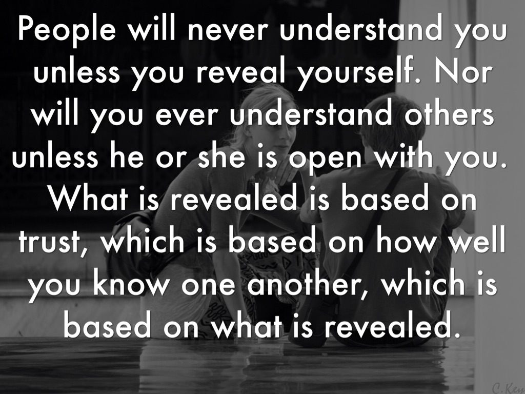 People will never understand you unless you reveal yourself. Nor will you ever understand others unless he or she is open with you. What is revealed is based on trust, which is based on how well you know one another, which is based on what is revealed.