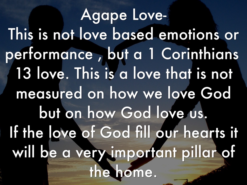 Agape Love- This is not love based emotions or performance , but a 1 Corinthians 13 love. This is a love that is not measured on how we love God but on how God love us. If the love of God fill our hearts it will be a very important pillar of the home.
