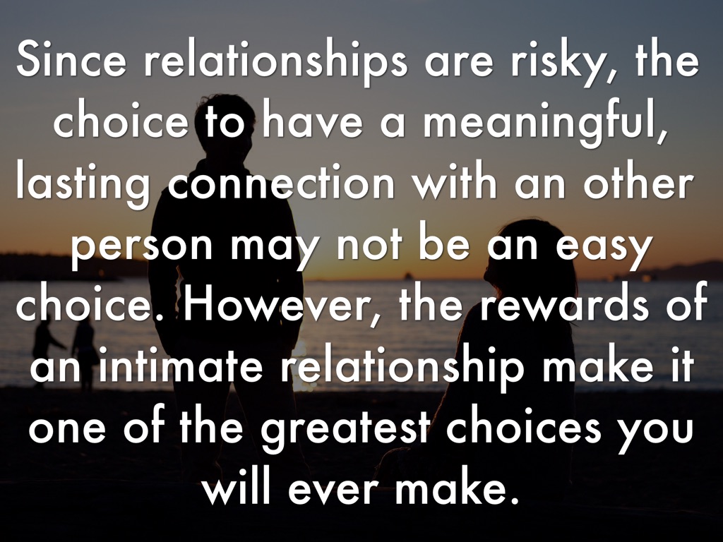 Since relationships are risky, the choice to have a meaningful, lasting connection with an other person may not be an easy choice. However, the rewards of an intimate relationship make it one of the greatest choices you will ever make.