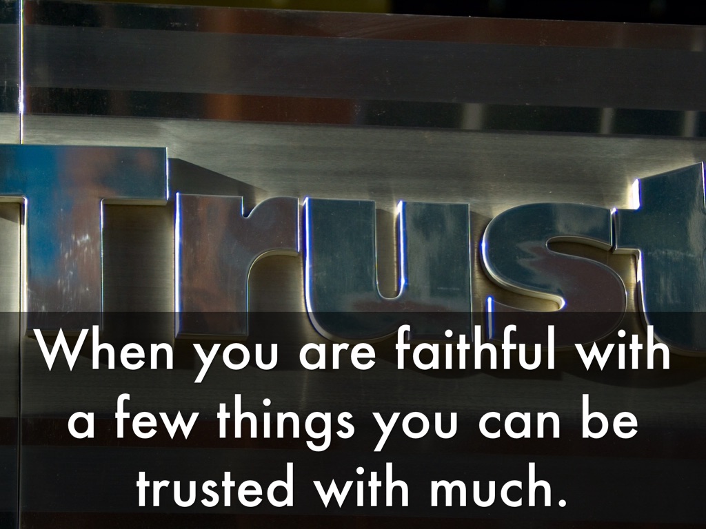 Luke 16:10 (NIV) “Whoever can be trusted with very little can also be trusted with much, and whoever is dishonest with very little will also be dishonest with much.” Matt 25:21 (NKJ) “His lord said to him, 'Well done, good and faithful servant; you were faithful over a few things, I will make you ruler over many things. Enter into the joy of your lord.'”
