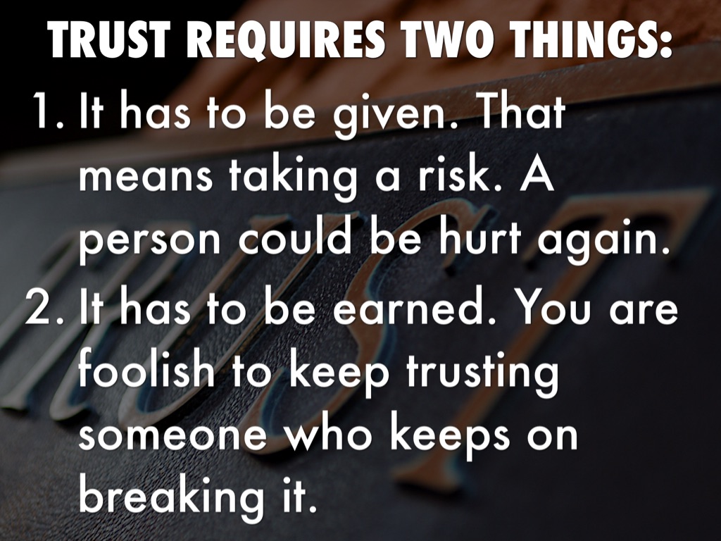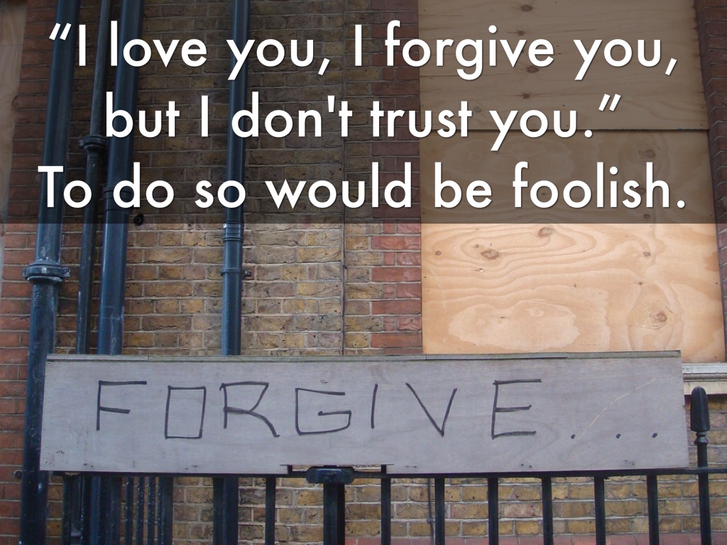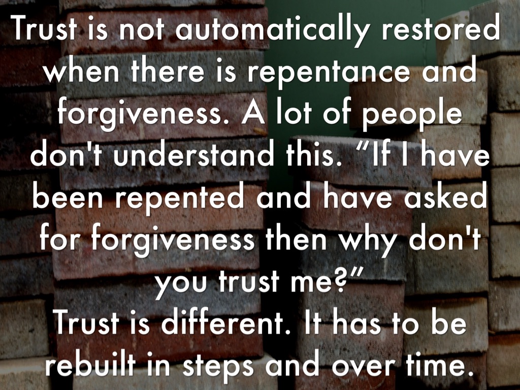 Trust is not automatically restored when there is repentance and forgiveness. A lot of people don't understand this. “If I have been repented and have asked for forgiveness then why don't you trust me?” Trust is different. It has to be rebuilt in steps and over time.