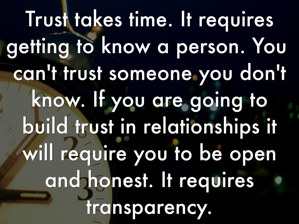 Trust takes time. It requires getting to know a person. You can't trust someone you don't know. If you are going to build trust in relationships it will require you to be open and honest. It requires transparency.