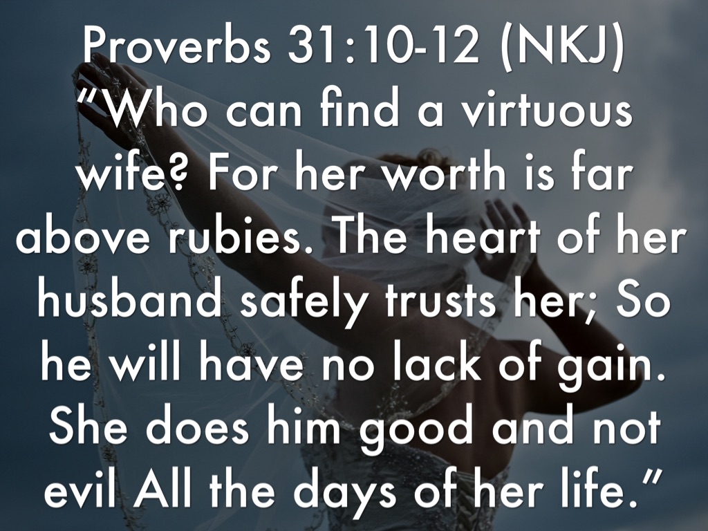 Proverbs 31:10-12 (NKJ) “Who can find a virtuous wife? For her worth is far above rubies. The heart of her husband safely trusts her; So he will have no lack of gain. She does him good and not evil All the days of her life.”