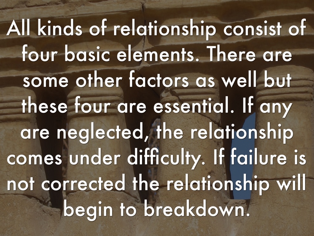All kinds of relationship consist of four basic elements. There are some other factors as well but these four are essential. If any are neglected, the relationship comes under difficulty. If failure is not corrected the relationship will begin to breakdown.
