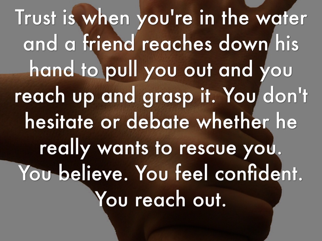 Trust is when you're in the water and a friend reaches down his hand to pull you out and you reach up and grasp it. You don't hesitate or debate whether he really wants to rescue you. You believe. You feel confident. You reach out.