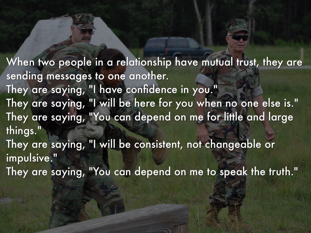 When two people in a relationship have mutual trust, they are sending messages to one another. They are saying, "I have confidence in you." They are saying, "I will be here for you when no one else is." They are saying, "You can depend on me for little and large things." They are saying, "I will be consistent, not changeable or impulsive." They are saying, "You can depend on me to speak the truth."