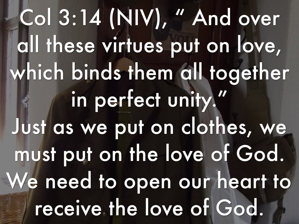 Col 3:14 (NIV), “ And over all these virtues put on love, which binds them all together in perfect unity.” Just as we put on clothes, we must put on the love of God. We need to open our heart to receive the love of God.