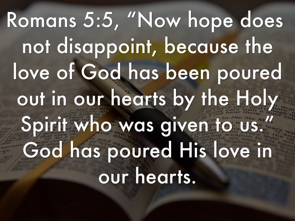 Romans 5:5, “Now hope does not disappoint, because the love of God has been poured out in our hearts by the Holy Spirit who was given to us.” God has poured His love in our hearts.