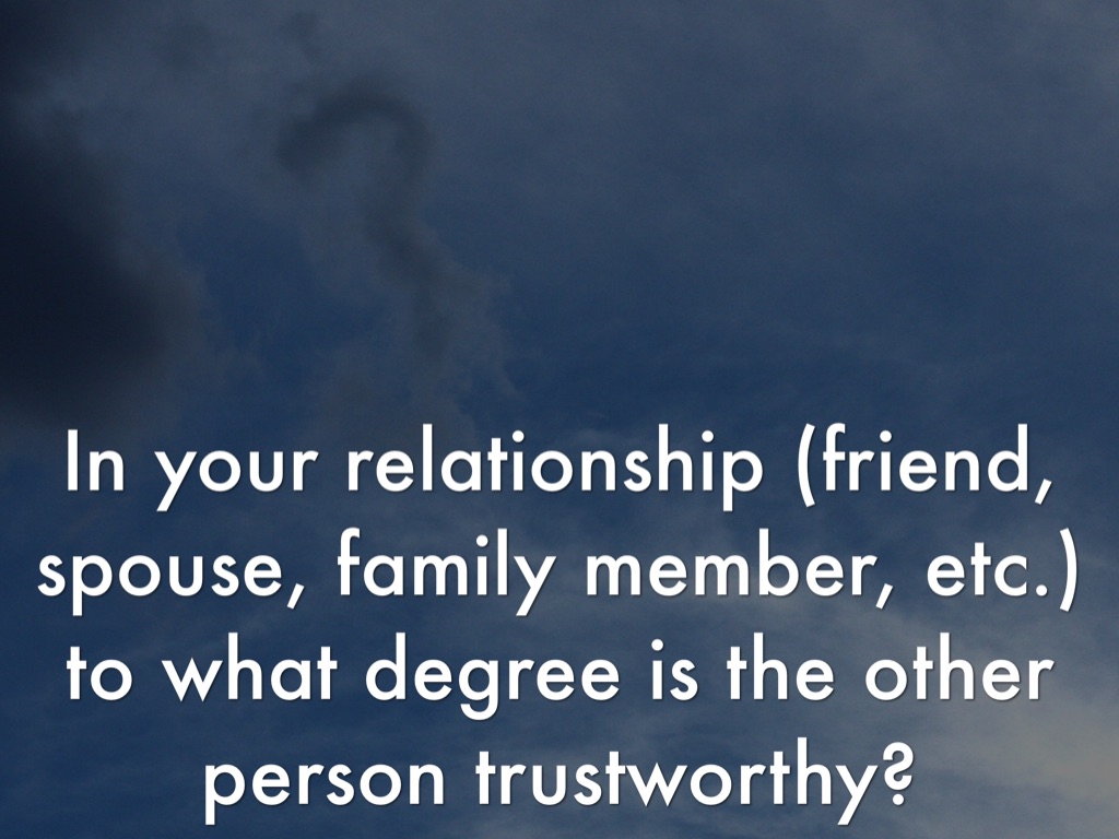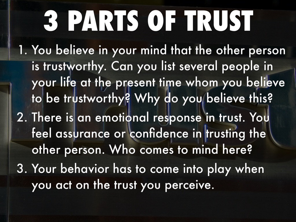 You believe in your mind that the other person is trustworthy. Can you list several people in your life at the present time whom you believe to be trustworthy? Why do you believe this?
