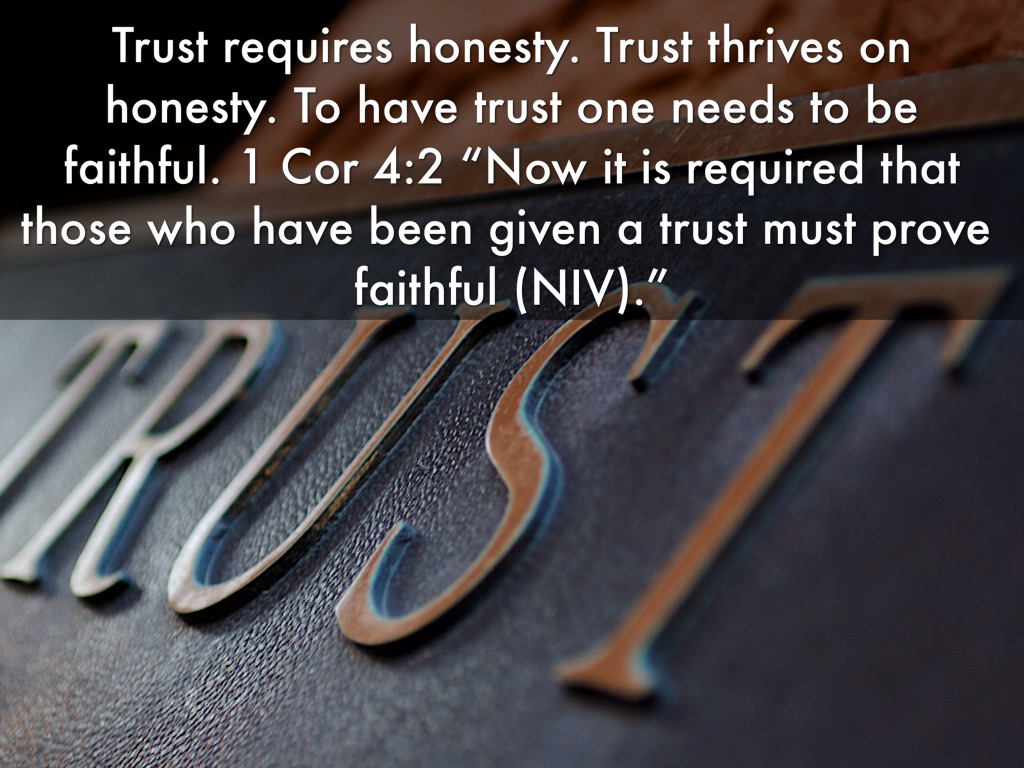 Trust requires honesty. Trust thrives on honesty. To have trust one needs to be faithful. 1 Cor 4:2 “Now it is required that those who have been given a trust must prove faithful (NIV).”