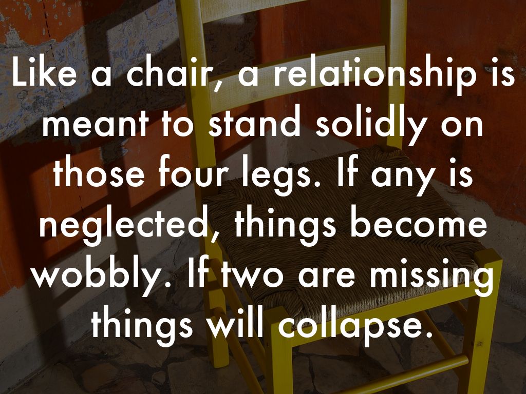 Like a chair, a relationship is meant to stand solidly on those four legs. If any is neglected, things become wobbly. If two are missing things will collapse.