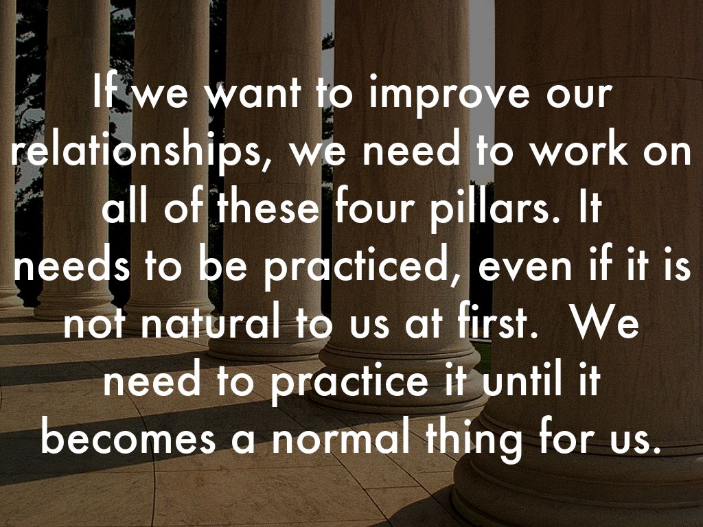If we want to improve our relationships, we need to work on all of these four pillars. It needs to be practiced, even if it is not natural to us at first. We need to practice it until it becomes a normal thing for us.