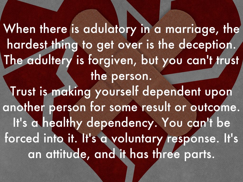When there is adulatory in a marriage, the hardest thing to get over is the deception. The adultery is forgiven, but you can't trust the person. Trust is making yourself dependent upon another person for some result or outcome. It's a healthy dependency. You can't be forced into it. It's a voluntary response. It's an attitude, and it has three parts.