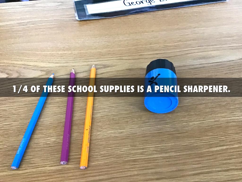 1/4 OF THESE SCHOOL SUPPLIES IS A PENCIL SHARPENER.