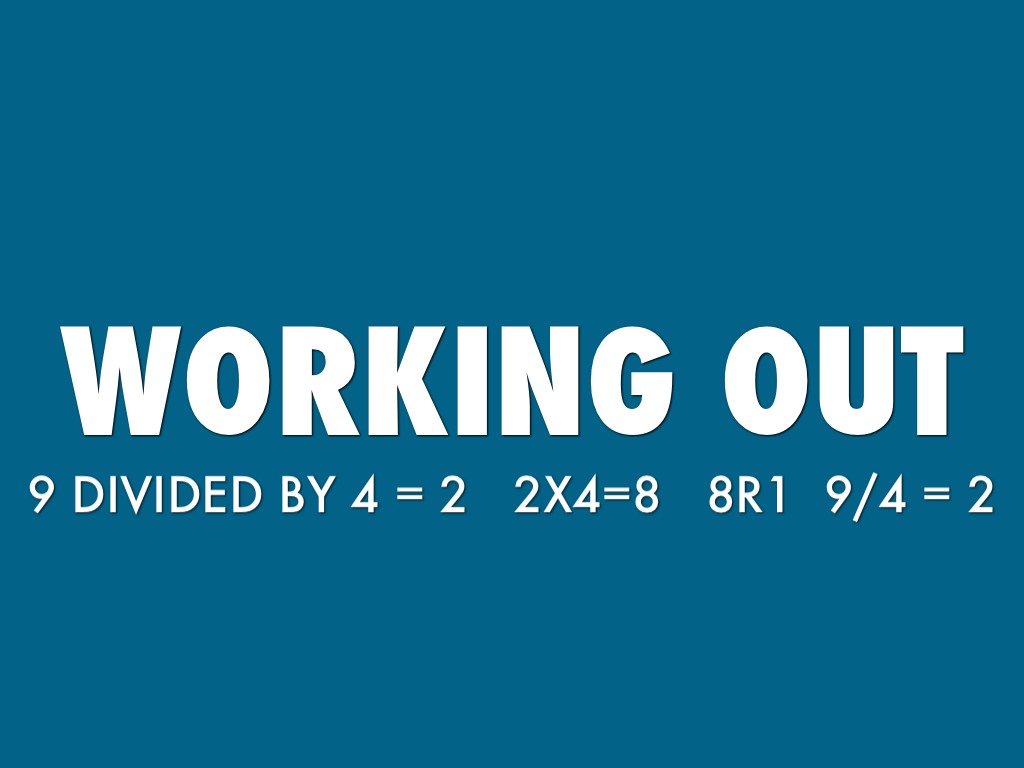 9 DIVIDED BY 4 = 2 2X4=8 8r1 9/4 = 2