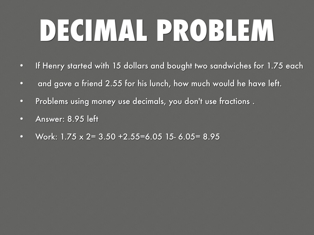 Problems using money use decimals, you don't use fractions .