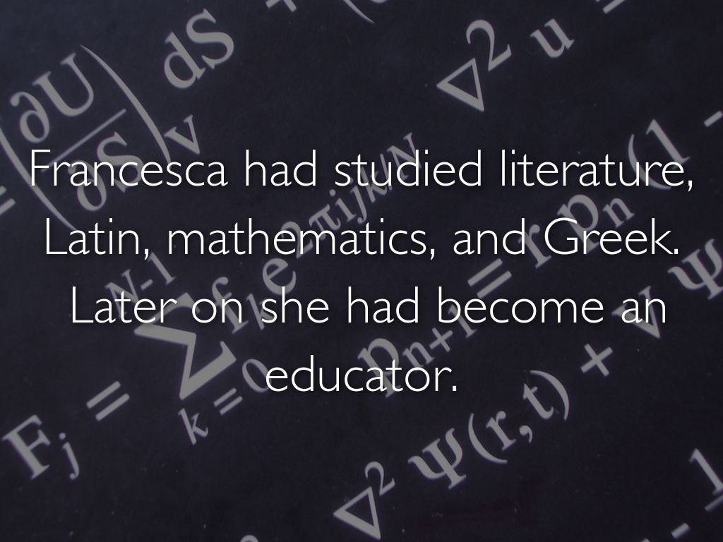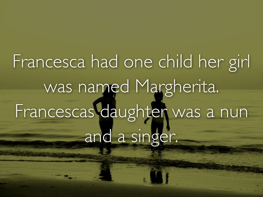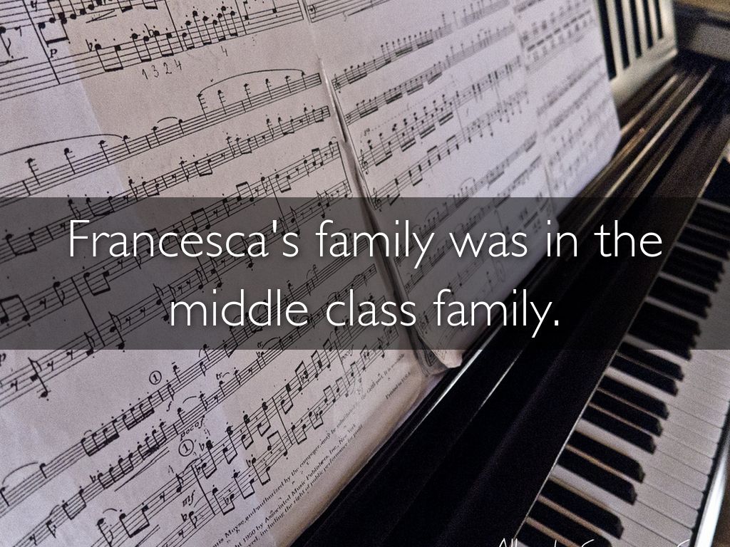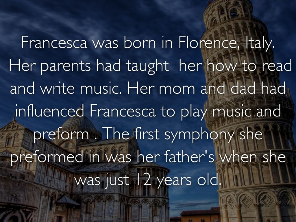 Francesca was born in Florence, Italy. Her parents had taught her how to read and write music. Her mom and dad had influenced Francesca to play music and preform . The first symphony she preformed in was her father's when she was just 12 years old.