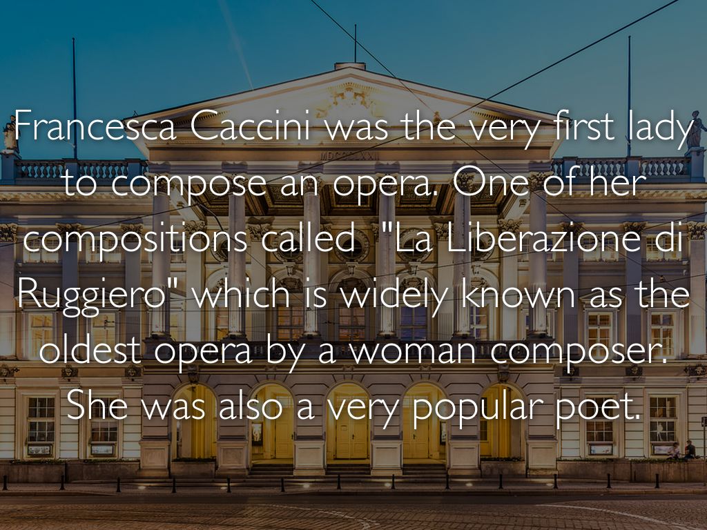 Francesca Caccini was the very first lady to compose an opera. One of her compositions called "La Liberazione di Ruggiero" which is widely known as the oldest opera by a woman composer. She was also a very popular poet.