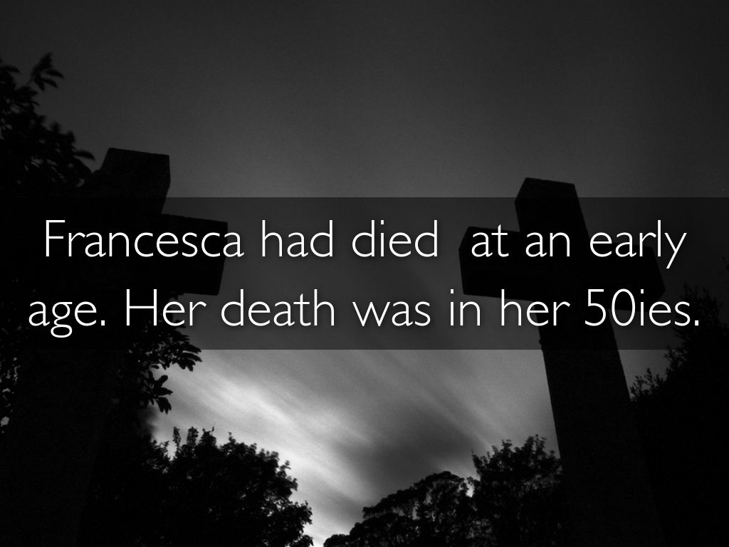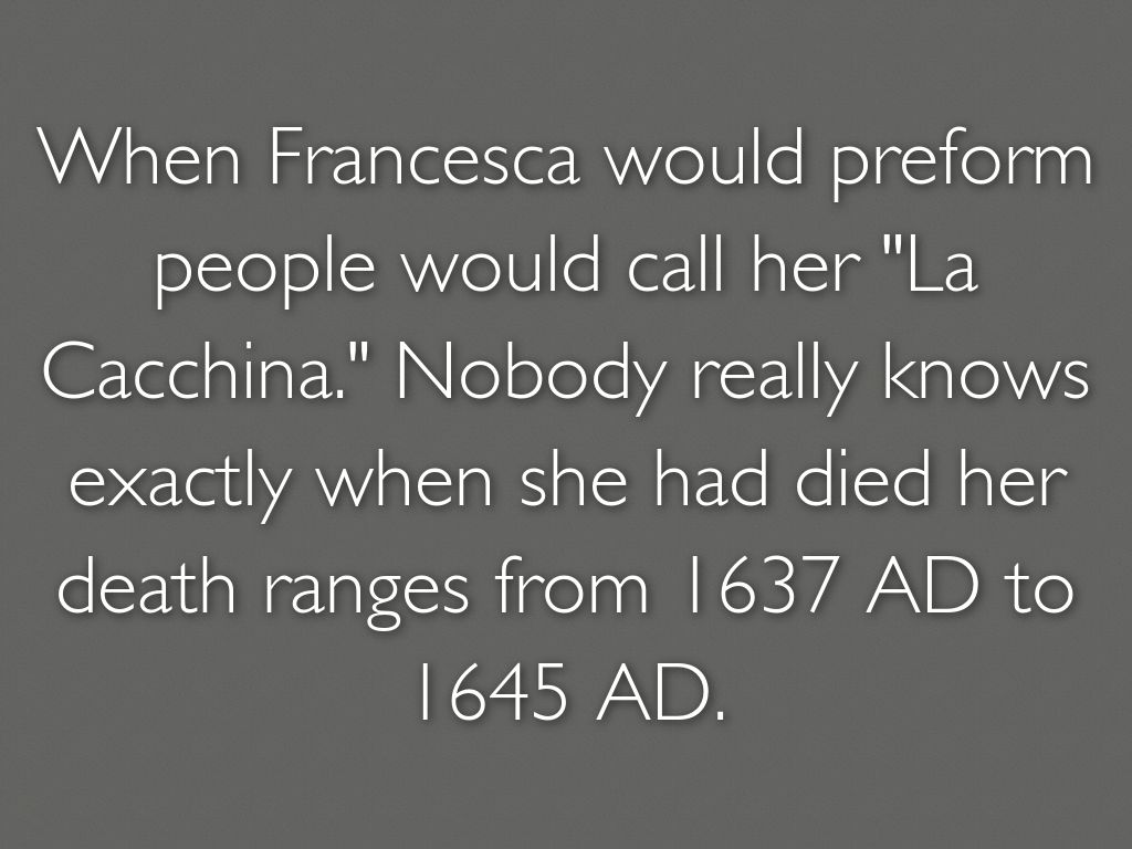 When Francesca would preform people would call her "La Cacchina." Nobody really knows exactly when she had died her death ranges from 1637 AD to 1645 AD.